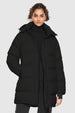 The back hem of the puffer jacket is slightly longer to provide a greater range of motion.