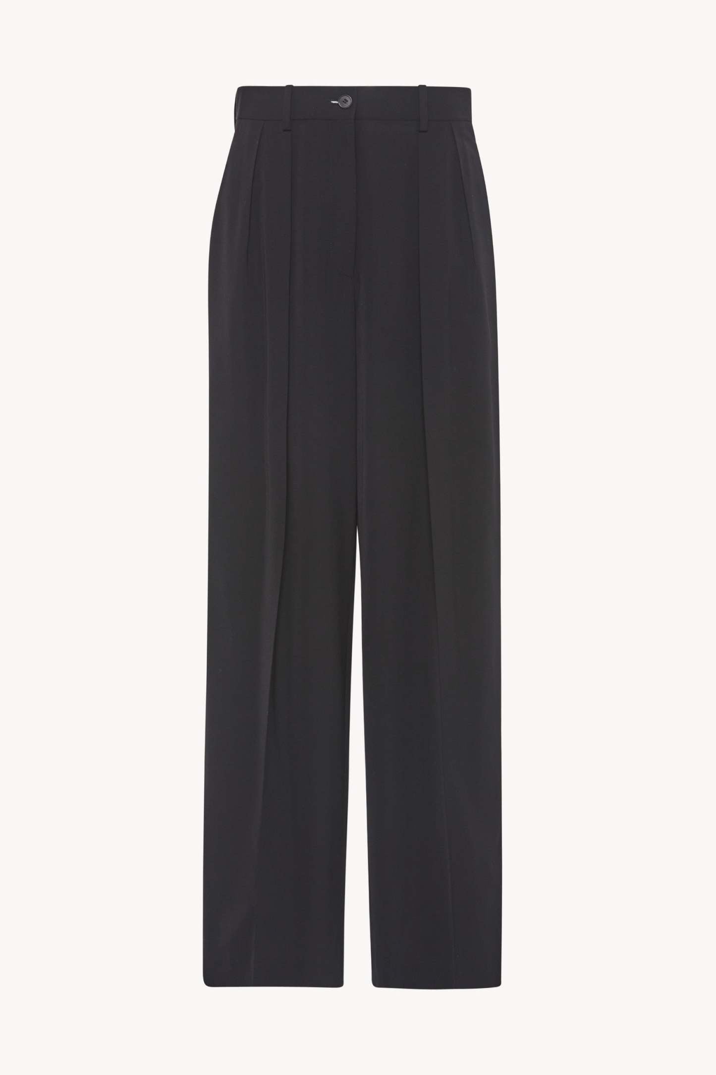 Low-waisted pant in lightweight viscose wool suiting with loose fluid leg, front double pleats and side slash pockets.