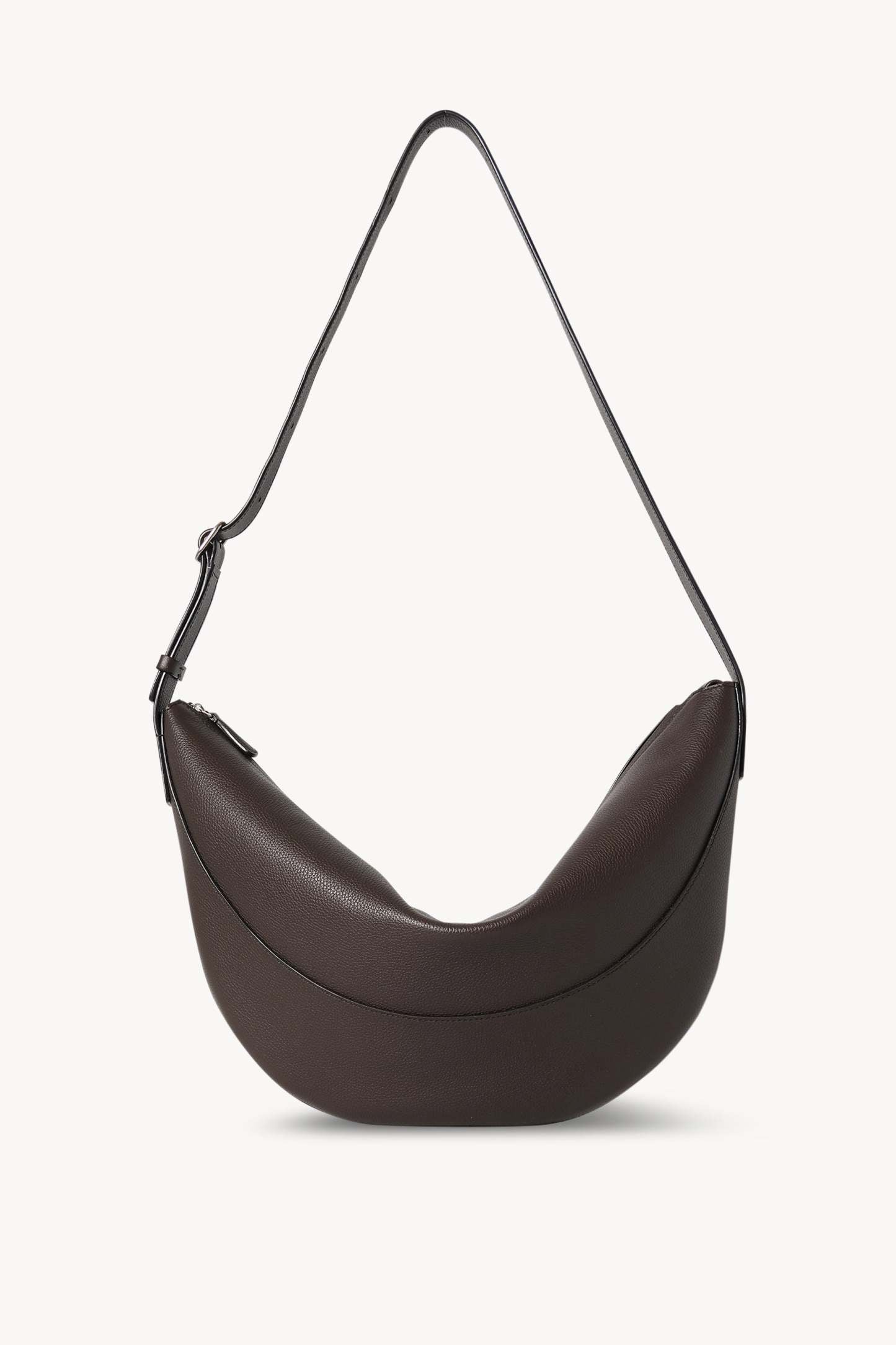 Crescent-shaped crossbody bag in smooth lightweight nappa leather with zipper closure and adjustable strap with metal buckle.