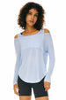 This athleisure top for women is perfect for both casual and athletic occasions, with a trendy off-the-shoulder design and side split for added flair.