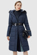 Long hooded puffer coat with concealed zip-and-snap placket, 2 side-entry zip pockets, removable hood with faux fur trim.