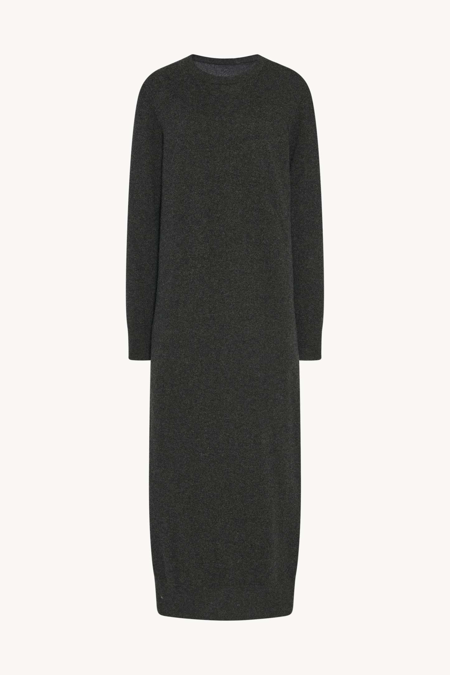 Ankle-length long-sleeved dress in soft cashmere with loose fit, seamless construction, and ribbed crewneck, cuffs, and hem.