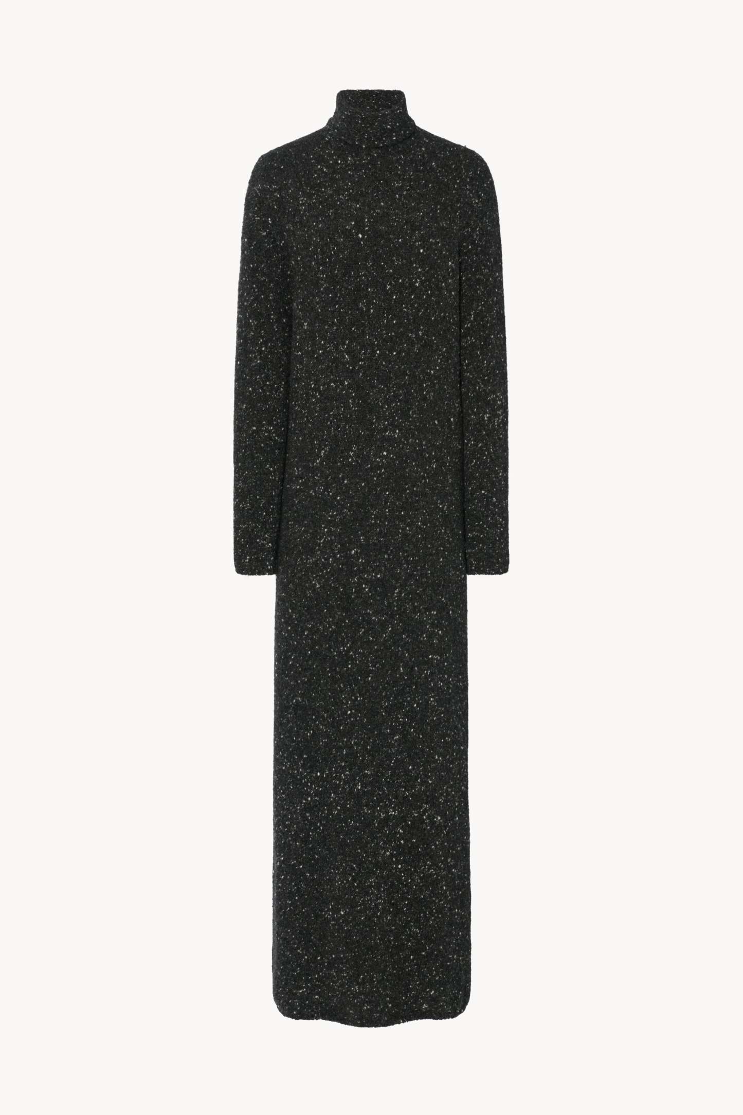 Ankle-length column dress in speckled midweight cashmere with rolled turtleneck and seamless construction.