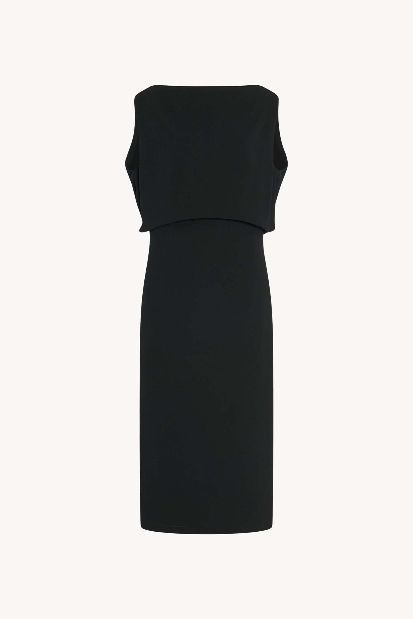 Calf-length column dress in smooth heavyweight silk with open back slit, center back hem vent, and concealed back zip closure with hook & eye at neckline.