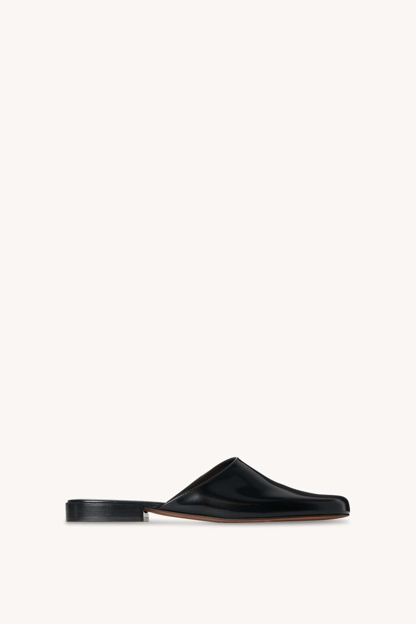 Streamlined slip-on shoe in glossy patent leather with square toe, stacked heel, and rubber sole.
