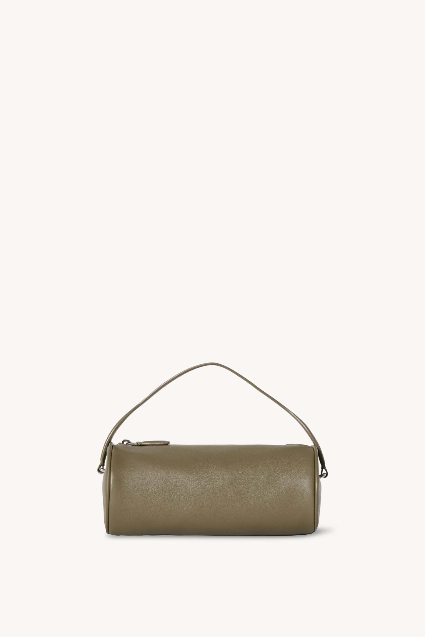 Rounded top handle bag in buttery lambskin leather with leather piping, flat handle, and top zipper closure.