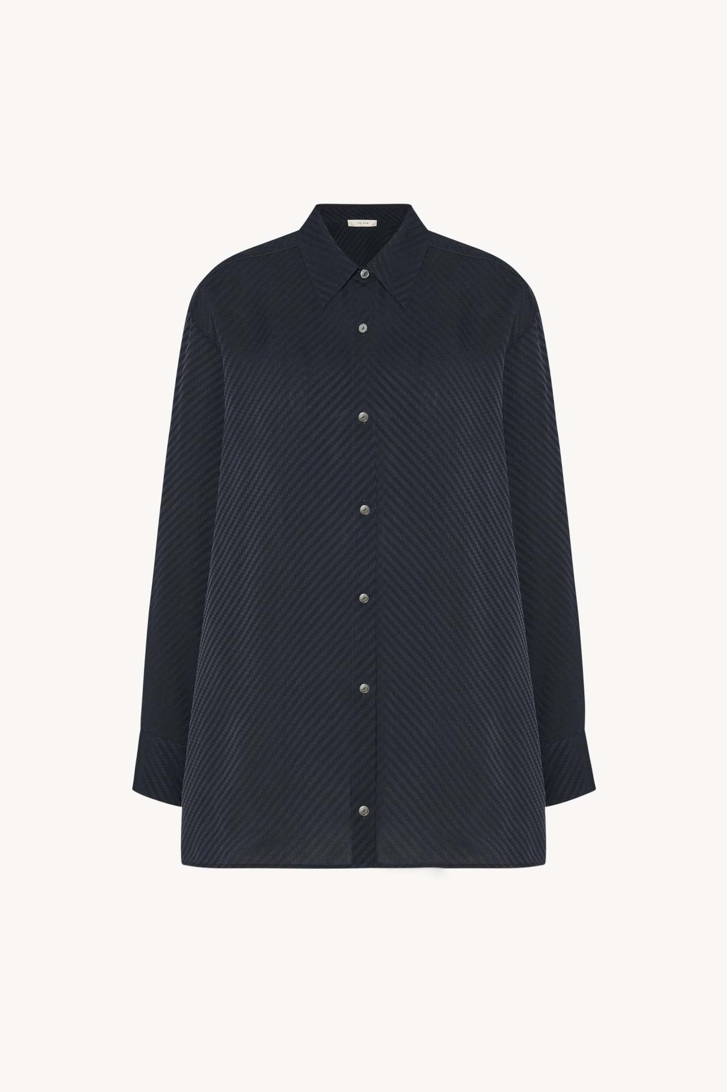 Classic button-up shirt in woven silk jacquard with relaxed fit, back yoke with side pleats, and exposed front placket with mother-of-pearl buttons.