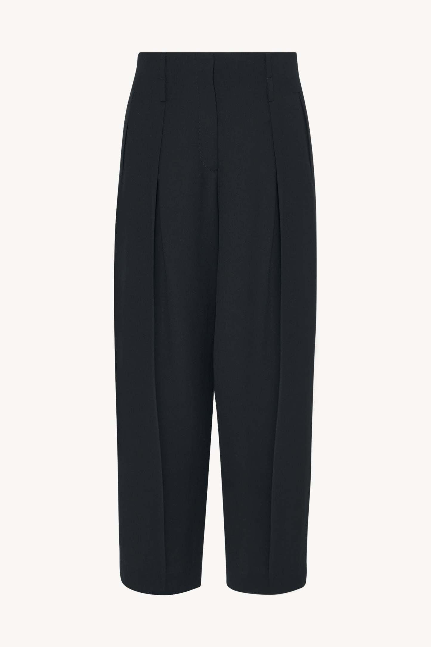 High-rise tailored trouser in lightweight silk twill with tapered hem, pressed front and back creases, and side welt pockets.