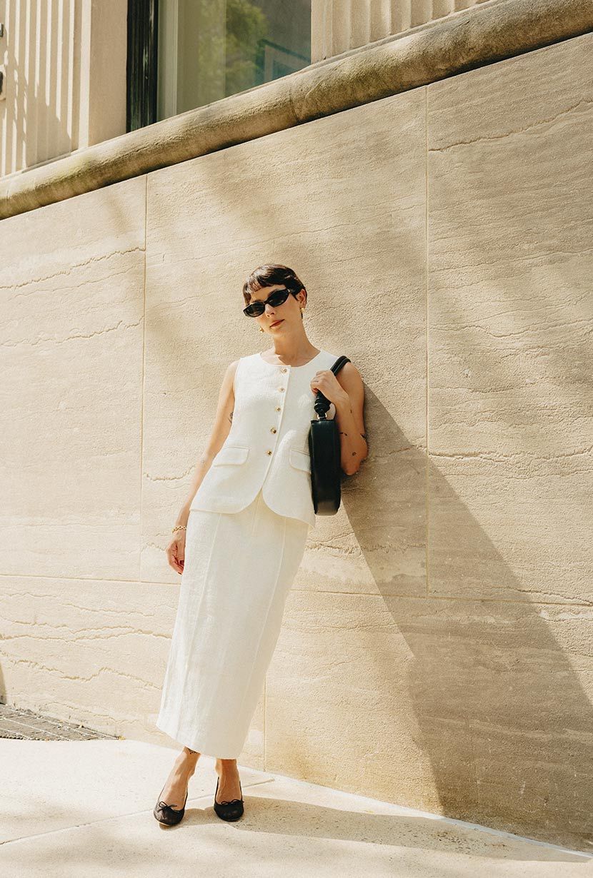 • Style with Ines Linen Vest in White and Chunky Intertwined Gold Hoop Stud Earrings