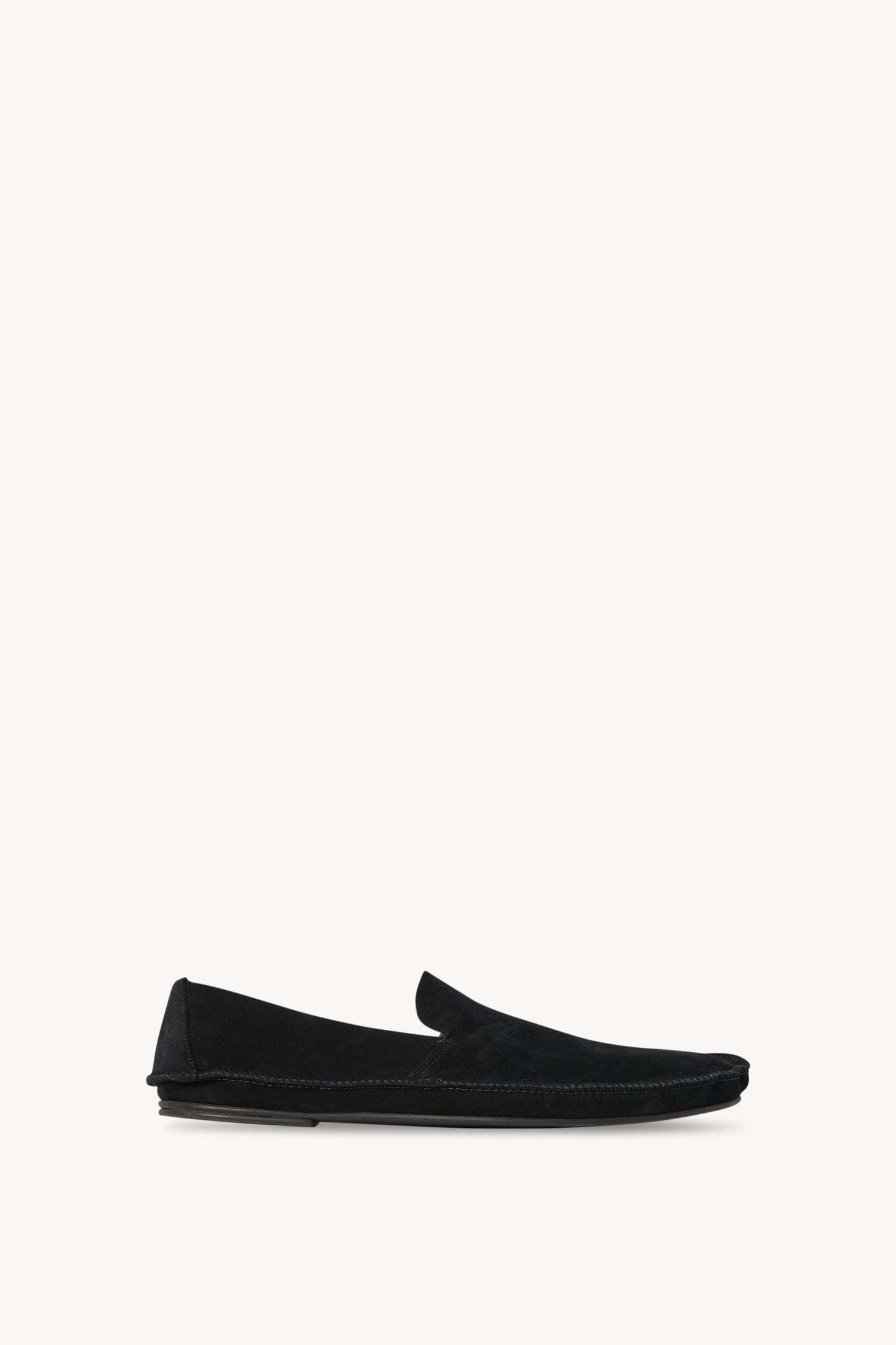 Minimal loafer in soft calfskin suede with oval toe, raised outer stitching, and rubber sole.